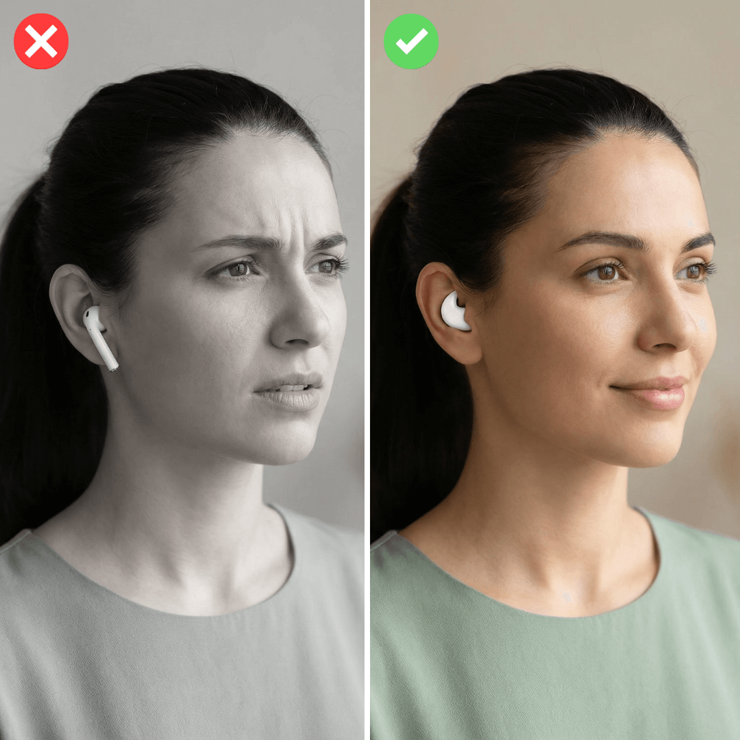 האוזניות שלנו עוצבו במיוחד בשביל זה. הן נכנסות לאוזן ולא בולטות החוצה - ככה שגם אם אתם ישנים על הצד אתם אפילו לא תרגישו אותן.